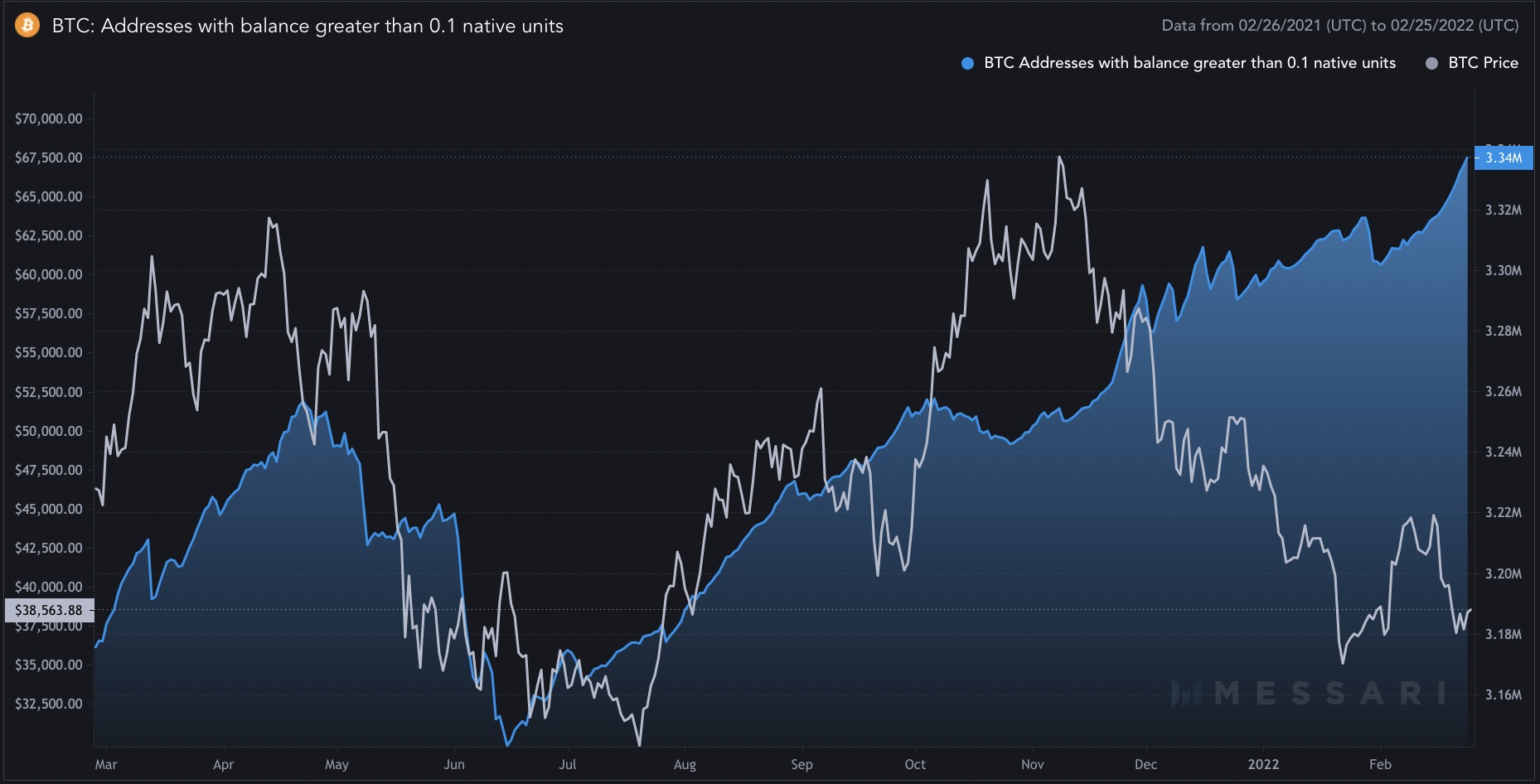 The number of Bitcoin addresses with a balance greater than 0.01 BTC (~$400) reached a record high of 9.51 million, the latest data from Coin Metrics shows. Meanwhile, the number of addresses that hold at least 0.1 BTC (~$3,850) also reached 3.34 million for the first time in history.
