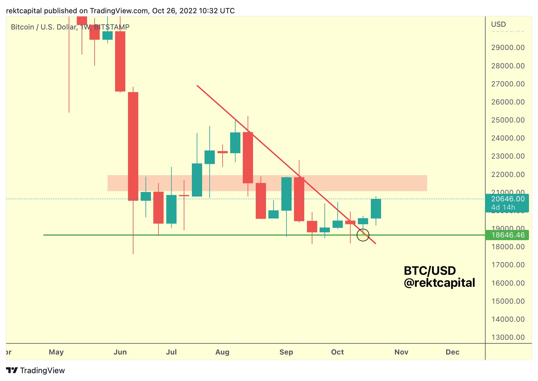 Analyzing the weekly BTC/USD chart, popular trader Rekt Capital highlighted the zone immediately below $22,000 as an important one to reclaim should bullishness continue.