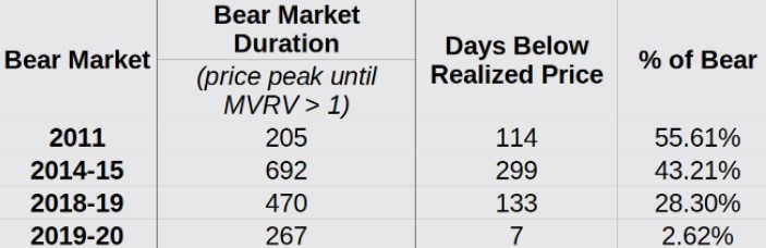 Previous bear markets saw the price of BTC trade below its realized price for extended periods of time, but the amount of time has actually decreased every cycle with Bitcoin only spending seven days below its realized price during the bear market of 2019–2020.