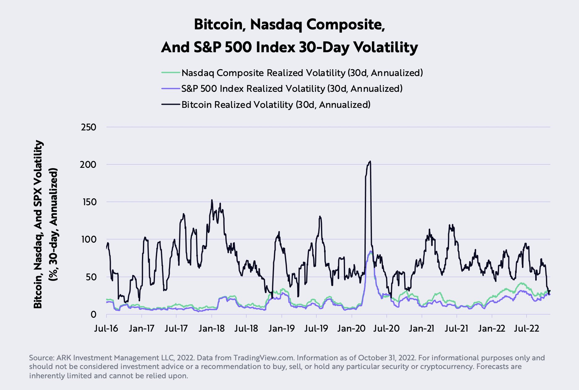 “For the first time in history, bitcoin is less volatile than both the S&P 500 and Nasdaq,” Yassine Elmandjra, a crypto analyst at ARK Invest, noted, linking to the firm’s latest report, “The Bitcoin Monthly.”