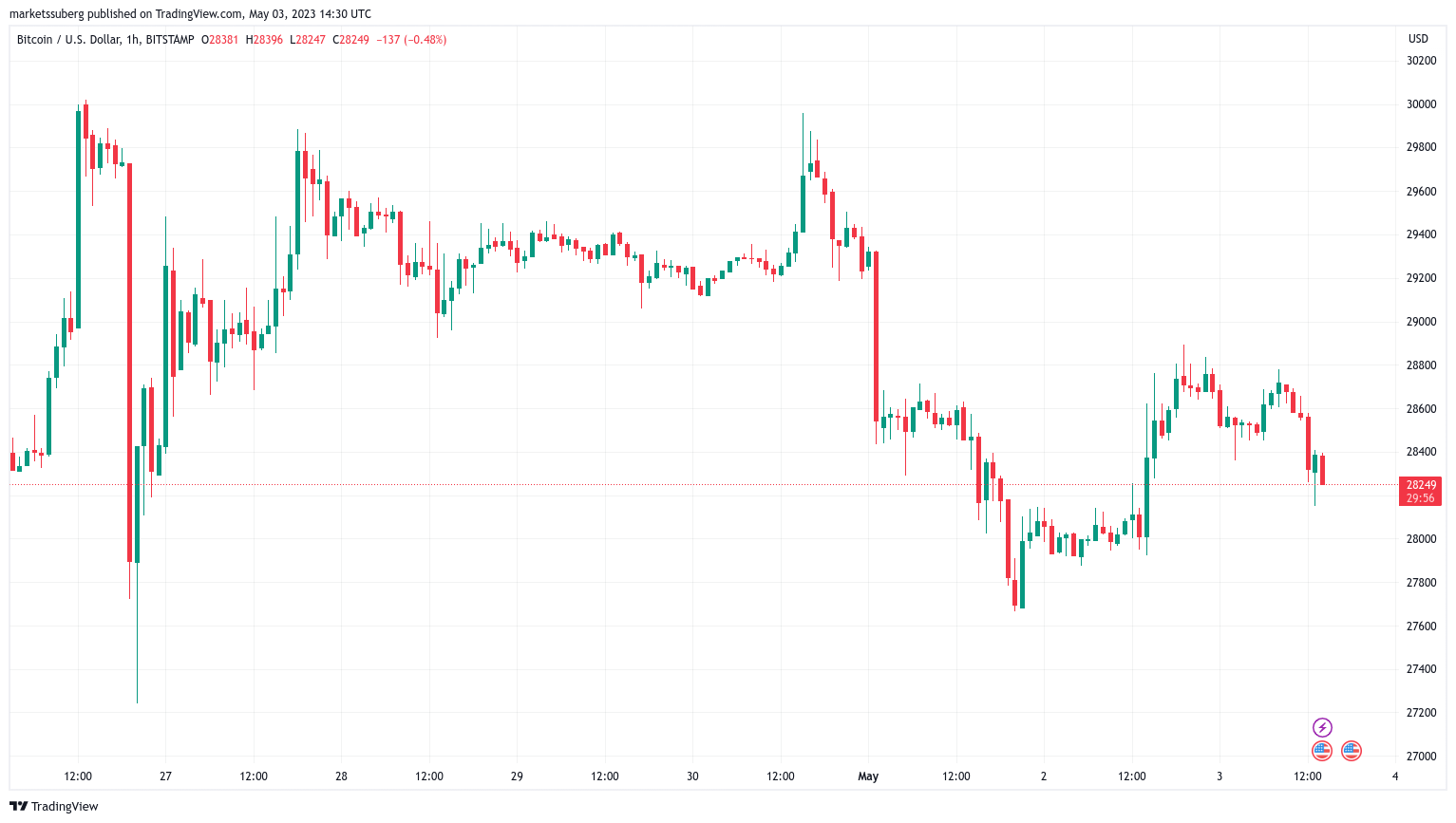 Data from Cointelegraph Markets Pro and TradingView showed BTC/USD reaching $28,152 on Bitstamp, down 2.2% from the day’s highs.