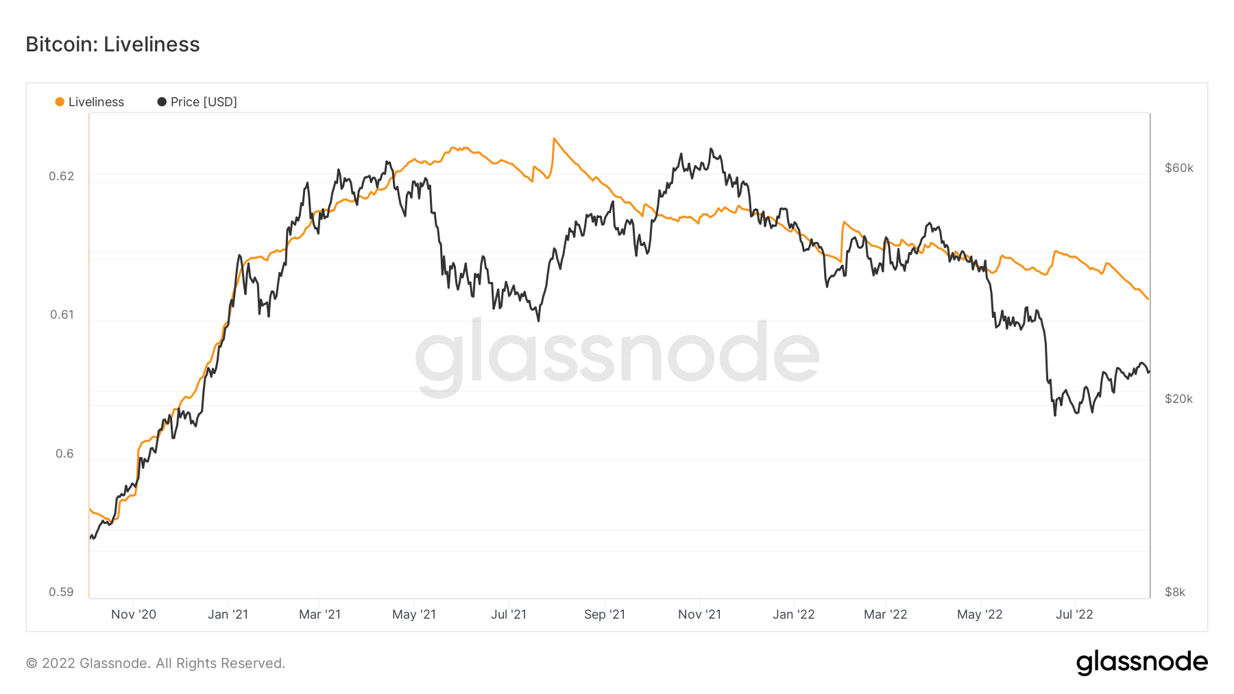 Now at 19-month lows, Liveliness points to increasing desire to hodl across the Bitcoin network in general.