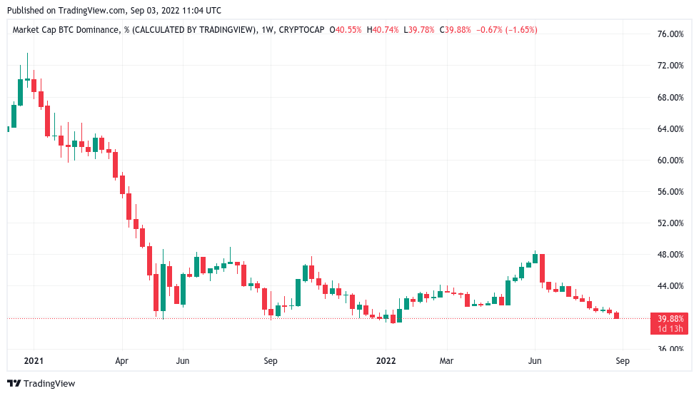 CoinMarketCap put Bitcoin dominance at just 39%, the weakest performance since June 2018.