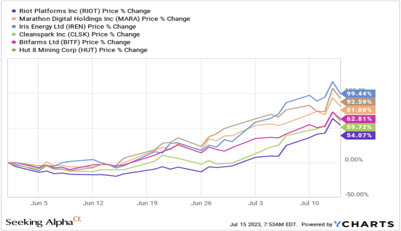 Bitcoin mining stocks have been on a tear this year, outperforming BTC by a wide margin in recent months. While BTC has seen reduced volatility and a period of consolidation, Bitcoin mining companies’ stocks have risen by nearly 100% in a matter of months.