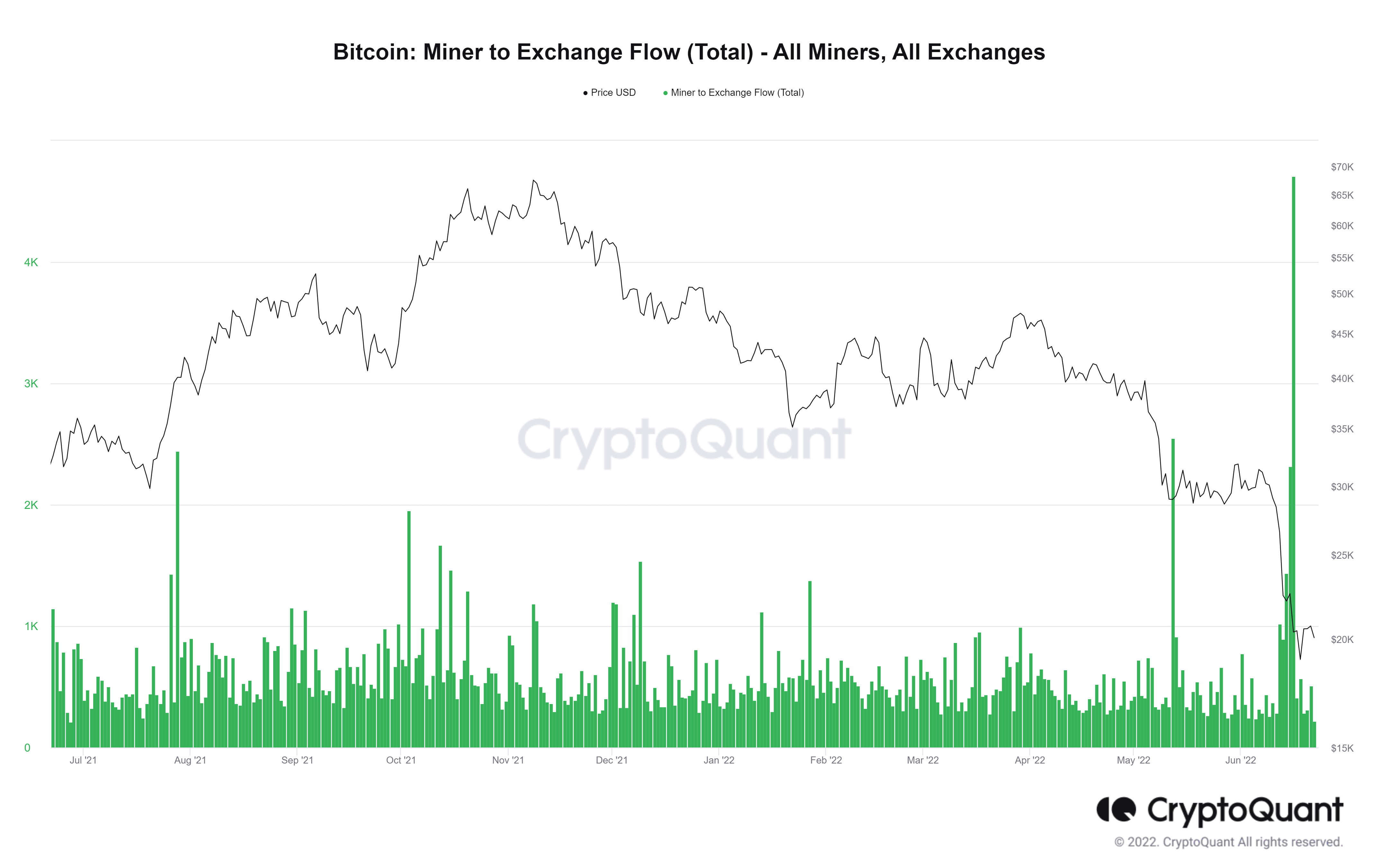 The condition has only worsened in June with the Bitcoin price falling below the 2017 high of $20,000 and recording a new 4-year low of $17,783. Miner’s to exchange flow, a data metric that shows the volume of BTC sent by miners onto exchanges has reached a new high in June, reaching a level not seen since January 2021.