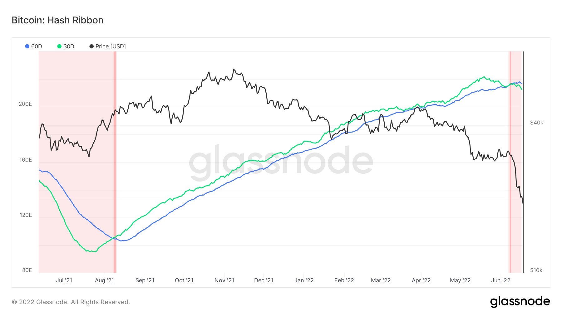 Bitcoin Hash Ribbon, an indicator that tries to identify periods where BTC miners are in distress and may be capitulating, has crossed, indicating many miners are unplugging their machines due to lack of profitability.