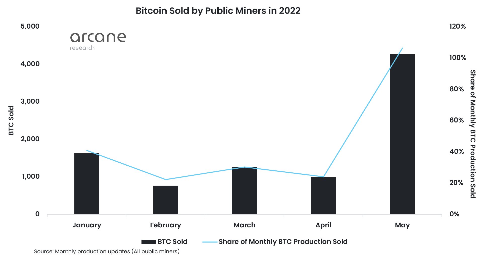 New data from Arcane research shows that public Bitcoin mining firms sold 100% of their BTC production in May compared to the usual 20-40% earlier.