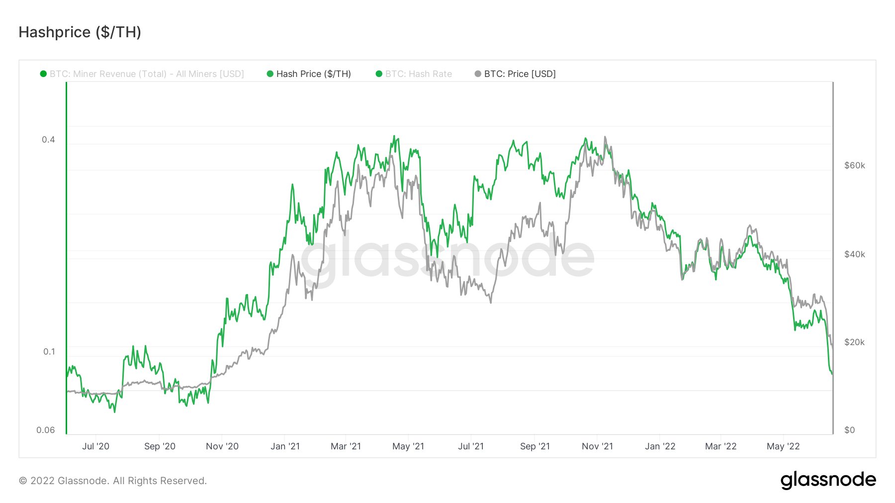 Bitcoin hash price is a mining metric that represents the miner revenue on a per terahash basis. It is the average value — in fiat currency — of the daily rewards a miner gets per each terahash calculation (USD/TH/s per day), which has fallen to a new 1.5-year low.