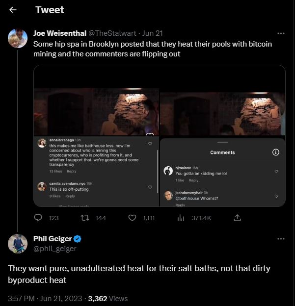 Another user further claimed that Bathhouse customers “want pure, unadulterated heat for their salt baths, not that dirty byproduct heat.” On the other hand, some reveled in the disdain users had for the mining-heated pools, while at least one seemed happy with them, saying, “I for one think this is a great way to heat the pools and will check this place out because of this.”
