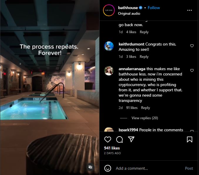 Instagram users who follow the Bathhouse account weren’t all sold on the idea. One user who identifies as Annalarranaga posted, “This makes me like Bathhouse less. Now I’m concerned about who is mining this cryptocurrency, who is profiting from it, and whether I support that. We’re gonna need some transparency.”