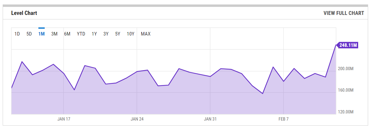 As evidenced by the above screenshot, the network hash rate jumped 31.69% — from 188.40 EH/s to 248.11 EH/s — in just one day. Moreover, the Bitcoin network’s hash rate levels rose 54.33% over the past year.