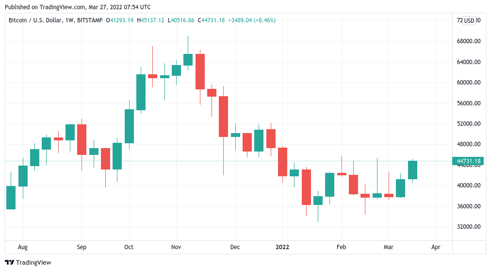 https://images.cointelegraph.com/images/840_aHR0cHM6Ly9zMy5jb2ludGVsZWdyYXBoLmNvbS91cGxvYWRzLzIwMjItMDMvNmMyNTY5YmYtODZmYi00NzdlLThmZDAtOTI3NDA4YTg5NmUyLmpwZw==.jpgBitcoin (BTC) saw a fresh spike to near $45,000 overnight into March 27 as the weekend looked set to deliver a decisively bullish close.