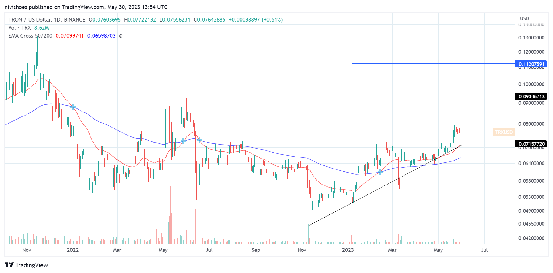 The TRX/USD pair has a bullish breakout from an ascending triangle pattern with a target of $0.112. Before the pattern’s bullish target is reached, buyers will face resistance at the 2022 high levels of around $0.093.