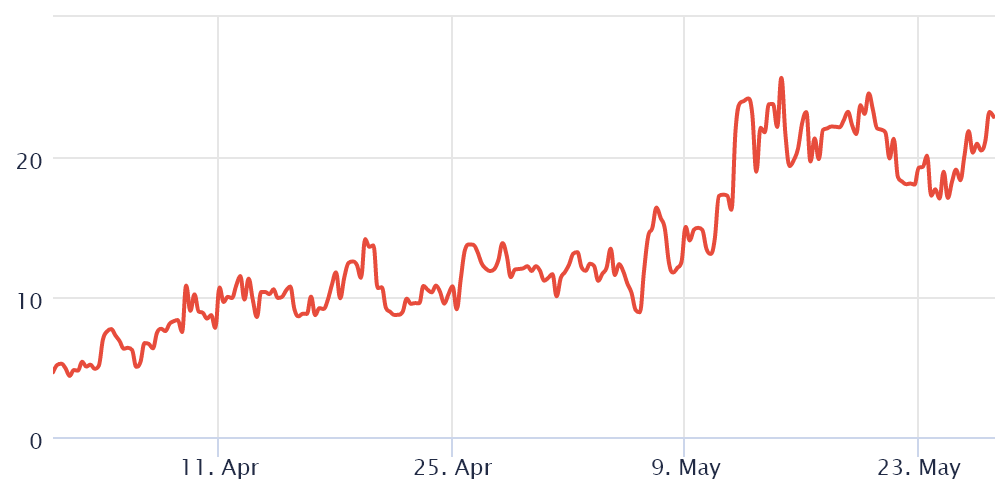 The above chart shows that traders have been borrowing more USD Tether recently, because the ratio increased from 13 on May 25 to the current 20. The higher the indicator, the more confident professional traders are with Bitcoin’s price.
