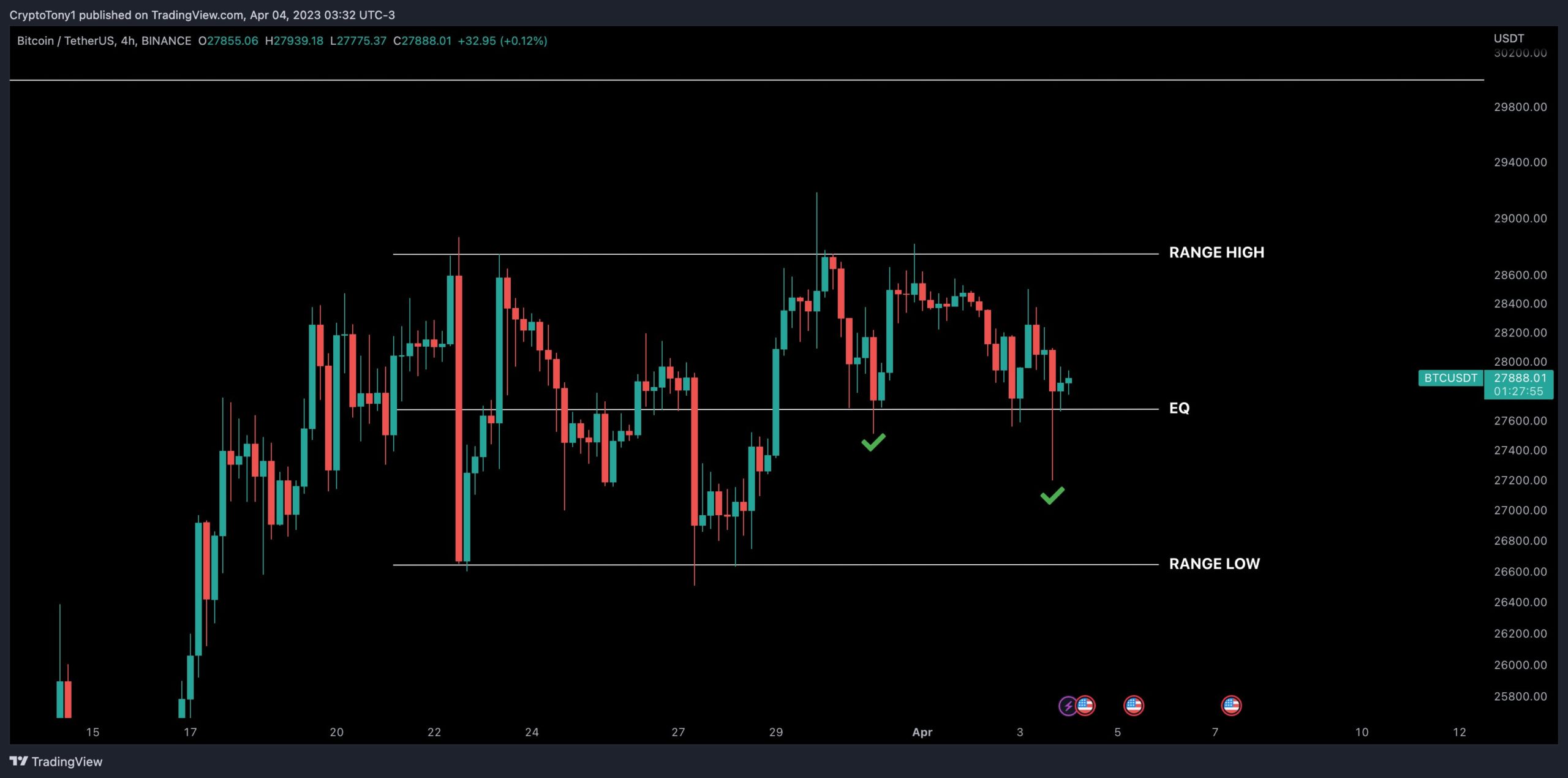 Eyeing the equilibrium (EQ) level of the current range at $27,700, fellow trader Crypto Tony also remained upbeat.