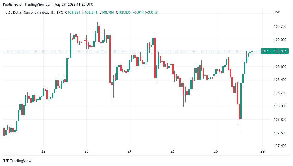 At the end of Aug. 26, DXY stood around just under 108.9, up from lows of 107.6 within a matter of hours.