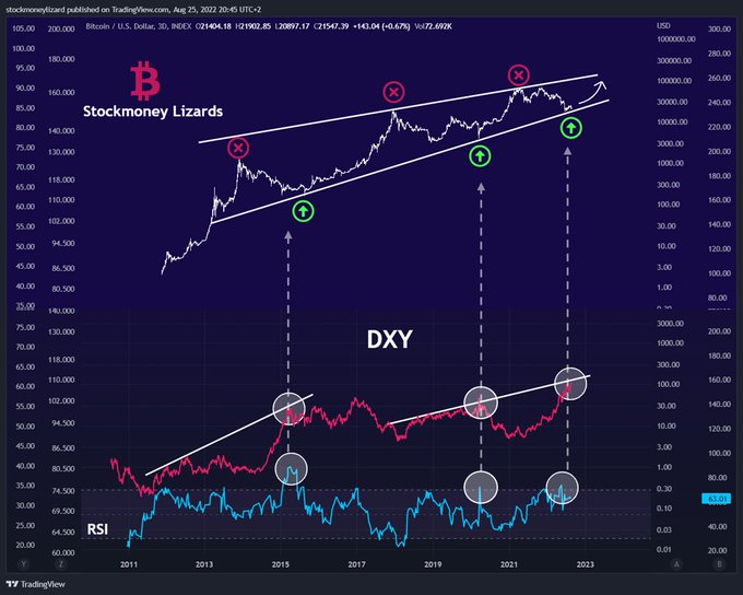 “If you’re accumulating Bitcoin in this bear, keep an eye on $DXY. All major bottoms in $BTC have coincided with local tops in $DXY,” he noted alongside a chart from trading platform Stockmoney Lizards.