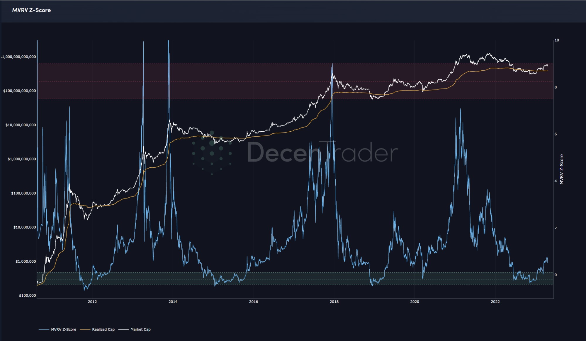 - MVRV Z-Score: Indicates levels of marketwide “profit” — the difference between market cap and realized cap. Currently, the market has just moved back into profit as the Z-score (blue line) has moved above the green accumulation zone. Still a long way to go until we get close to a market top.