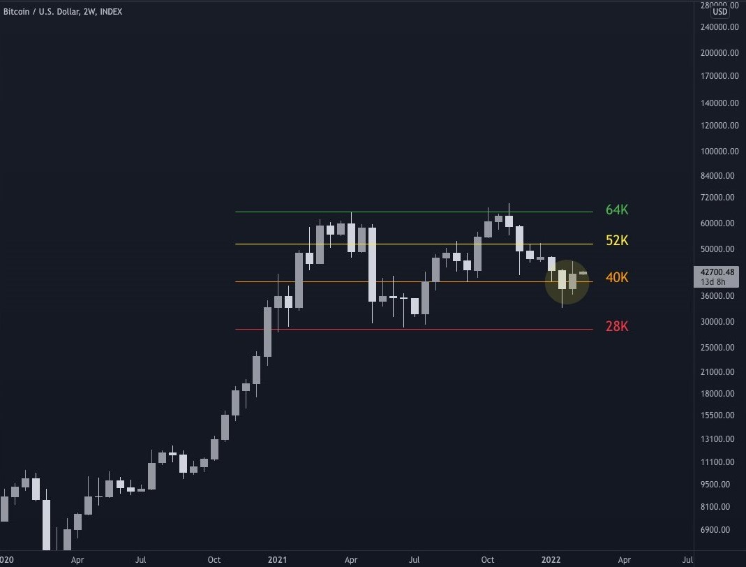 “Closing outside one has granted weeks of price action in the next. Yesterday’s 2W close above $40,000 suggests the previous close was a deviation. Current 2W key in determining which sub-range we’ll be spending the next few weeks.”