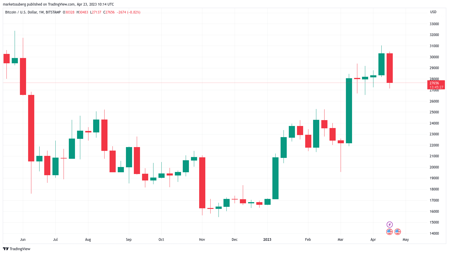 https://images.cointelegraph.com/images/840_aHR0cHM6Ly9zMy5jb2ludGVsZWdyYXBoLmNvbS91cGxvYWRzLzIwMjMtMDQvYzM4ZDA4MTAtM2ZhMC00Njg5LWE2NTgtYjU5MWM2NzhhMDYzLmpwZw==.jpgA “horrendous bearish engulfing” risks defining the weekly close, but all may not be lost, Bitcoin price analysts insist.