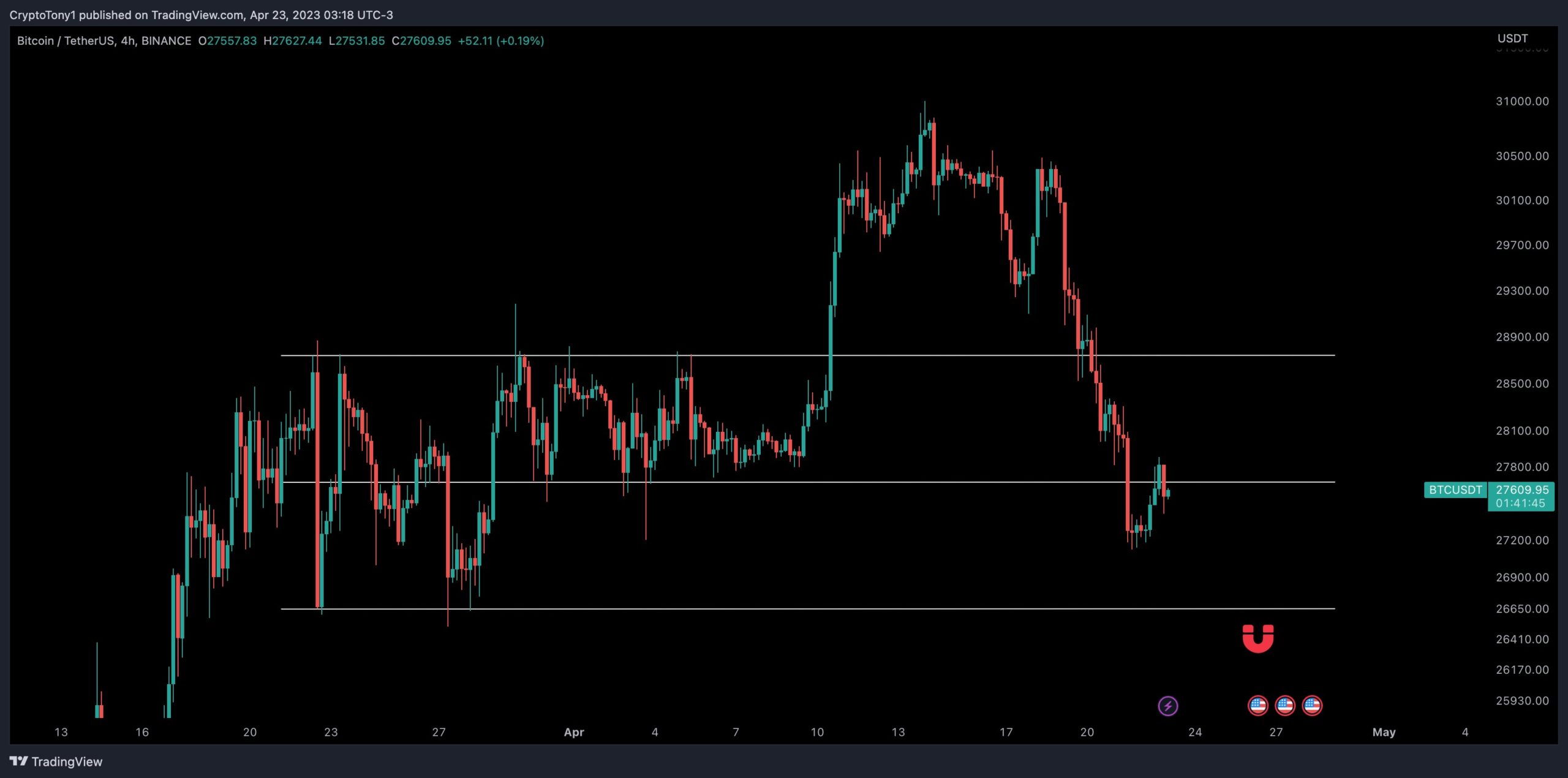 “$26,600 is my target in my short position right now, and being the weekend it may take a bit longer to get there,” Crypto Tony confirmed to Twitter followers on the day.