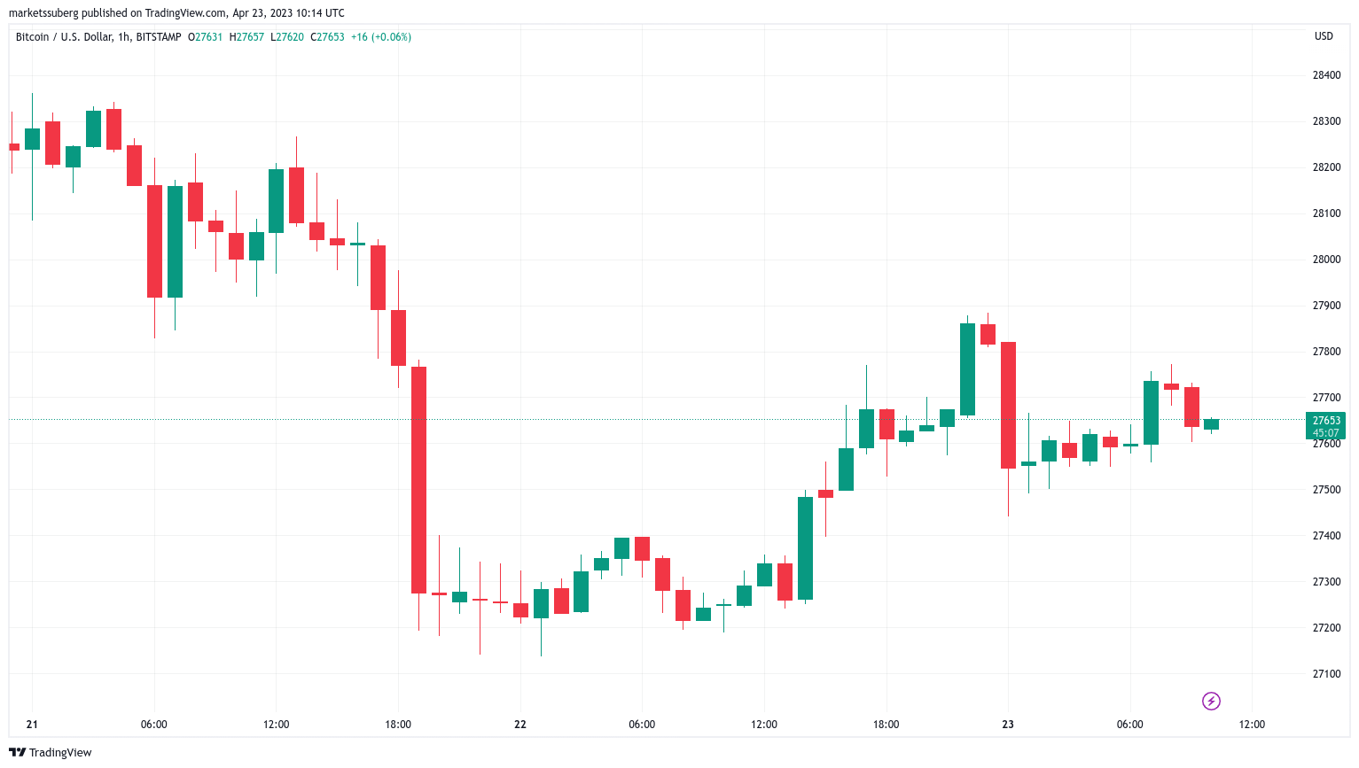 Data from Cointelegraph Markets Pro and TradingView followed BTC/USD as it rose to circle $27,700 at the time of writing.