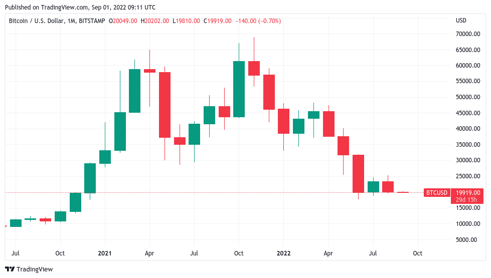 A knock to bulls’ efforts to stabilize spot price, the August close was only the second monthly candle finish below the $20,000 mark (depending on the exchange used) since late 2020.