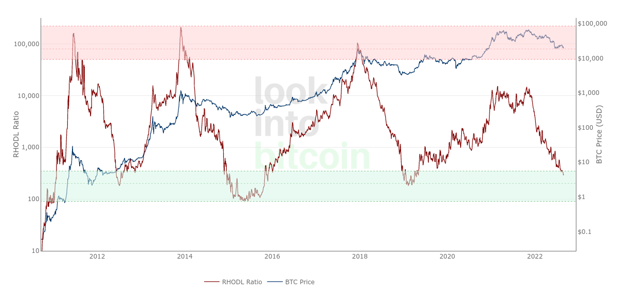 Bitcoin’s Realized Value Hodl (RHODL) ratio, which measures the relative value of coins moving in recent weeks compared to one or two years prior, now sits at its lowest ever.