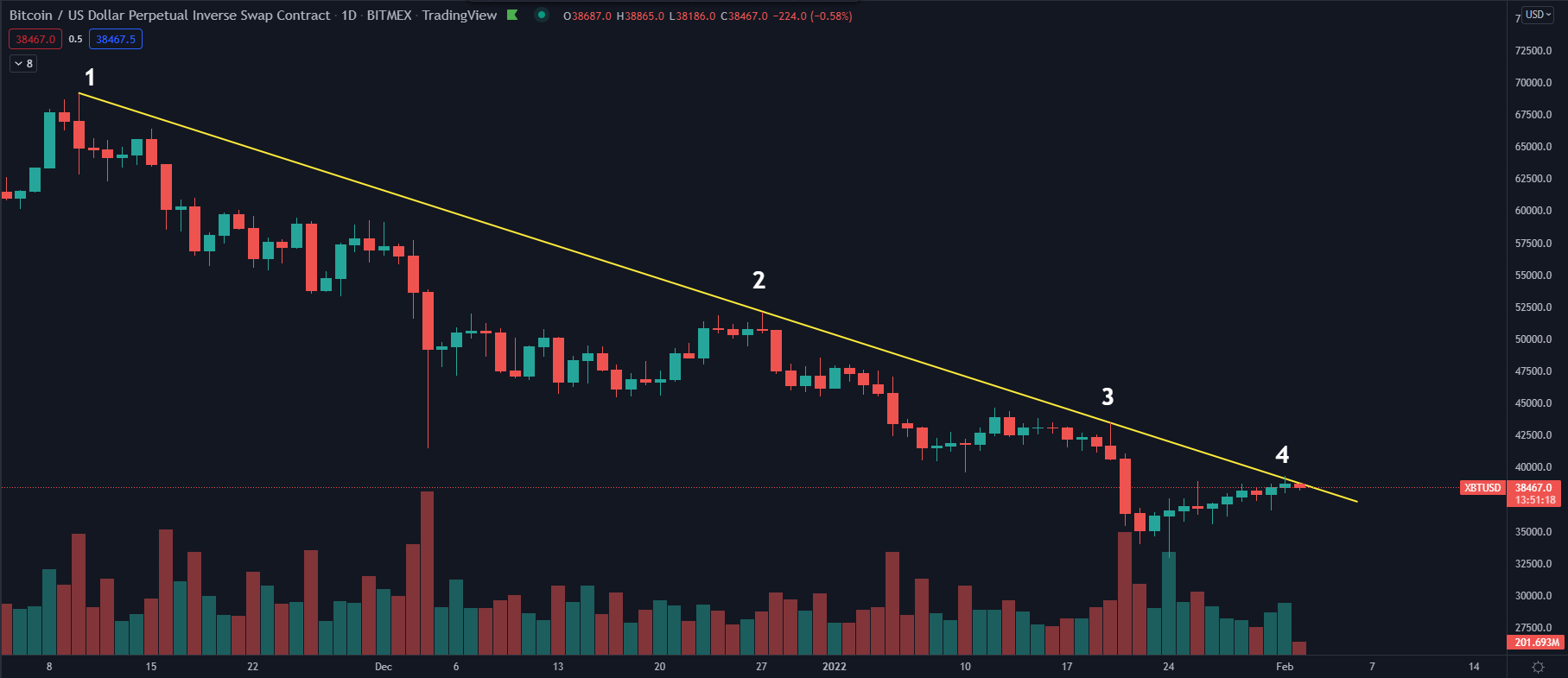 A look at the descending price action for BTC since topping out in November was provided by crypto trader and pseudonymous Twitter user ‘Daan Crypto Trades’, who posted the following chart highlighting the difficulty Bitcoin has had at breaking above this trend.