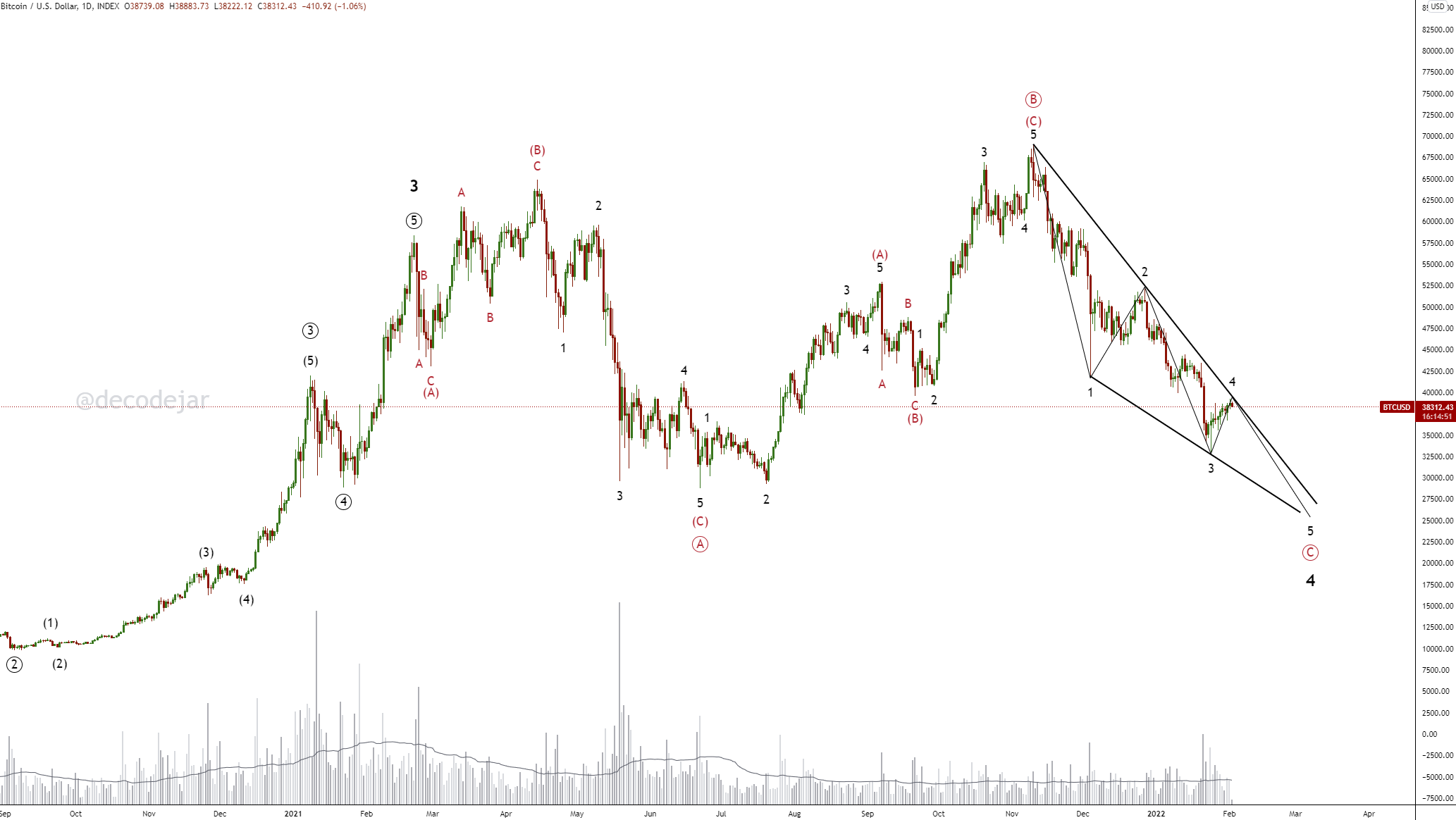 According to Decodejar, this is a common chart being circulated by analysts which shows a “bearish ABC wave 4 expanded flat, ending below last year’s lows.”