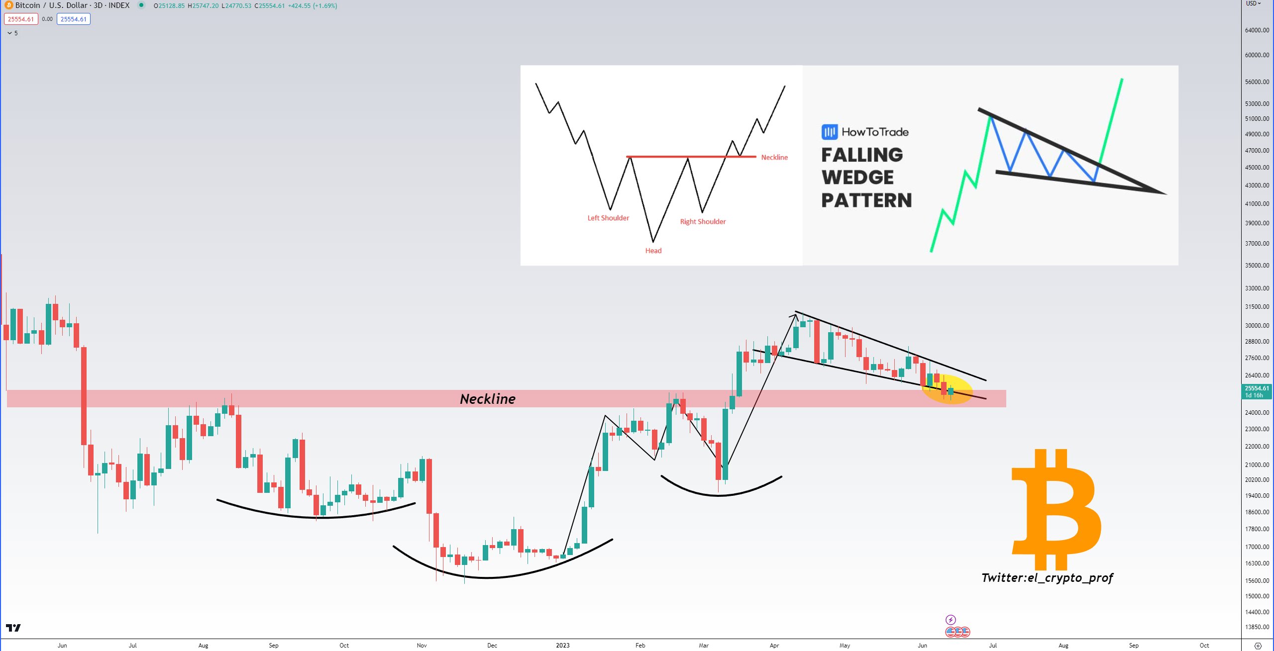 “Fakeouts are always possible, but it should be mentioned that $BTC is back in a falling wedge. – Retest of an Inverse Head & Shoulder-Pattern in the form of a Falling Wedge.”