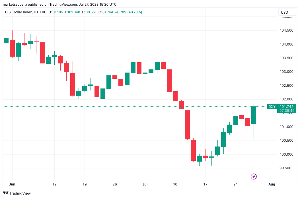 One conspicuous reaction traditionally a headwind for crypto was U.S. dollar strength, which spiked on July 27.
