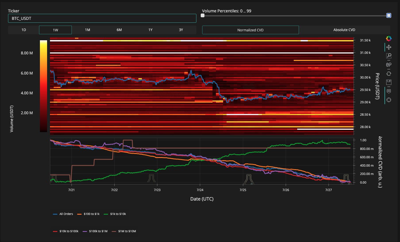 An accompanying chart of the BTC/USD order book on largest global exchange Binance showed support still thin above $28,500, potentially easing a market drop should one begin.