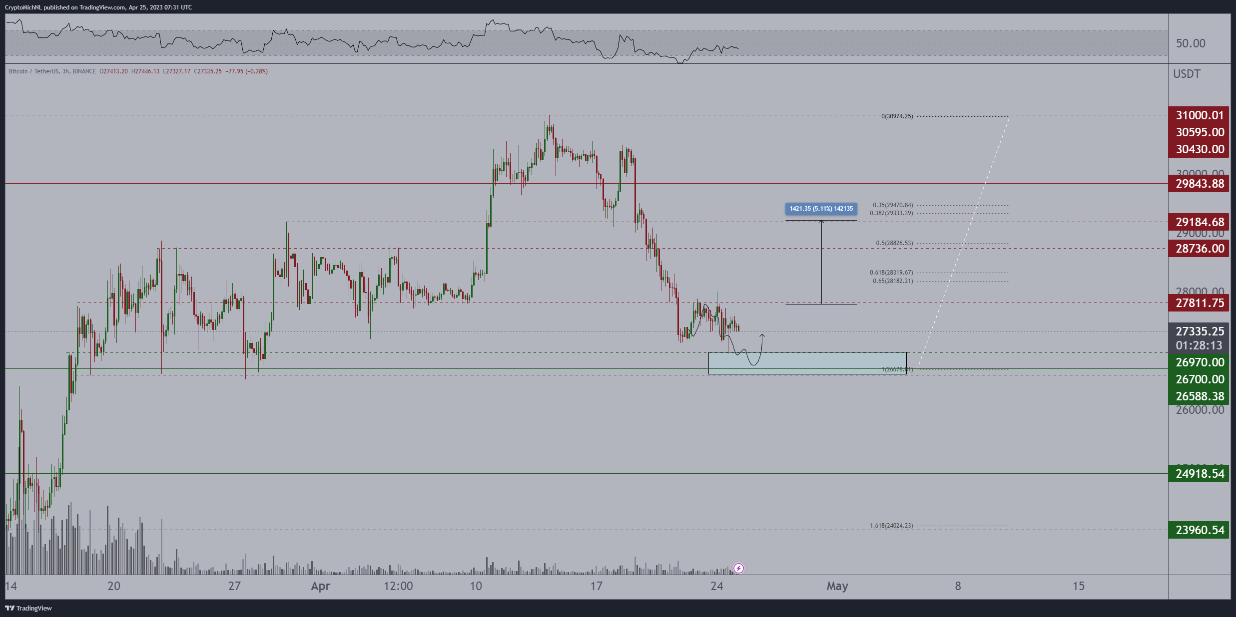An accompanying chart confirmed $26,600 as the downside target for the liquidity sweep.