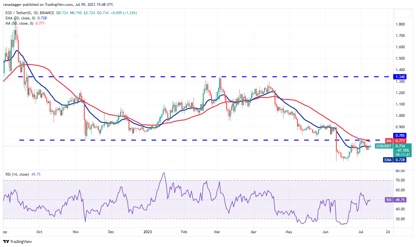 The 20-day EMA ($0.73) has flattened out and the RSI is near the midpoint, indicating that the selling pressure is reducing. Buyers will have to propel the price above the overhead resistance at $0.79 to indicate that the downtrend may be ending. The EOS/USDT pair could then surge toward $0.93.