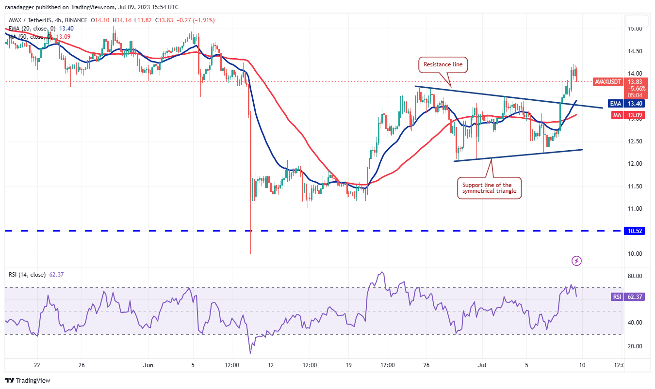 The moving averages are close to completing a bullish crossover and the RSI has jumped into the positive territory. This suggests that bulls have an edge. The AVAX/USDT pair could rise to $16 where the bears may again mount a strong defense.