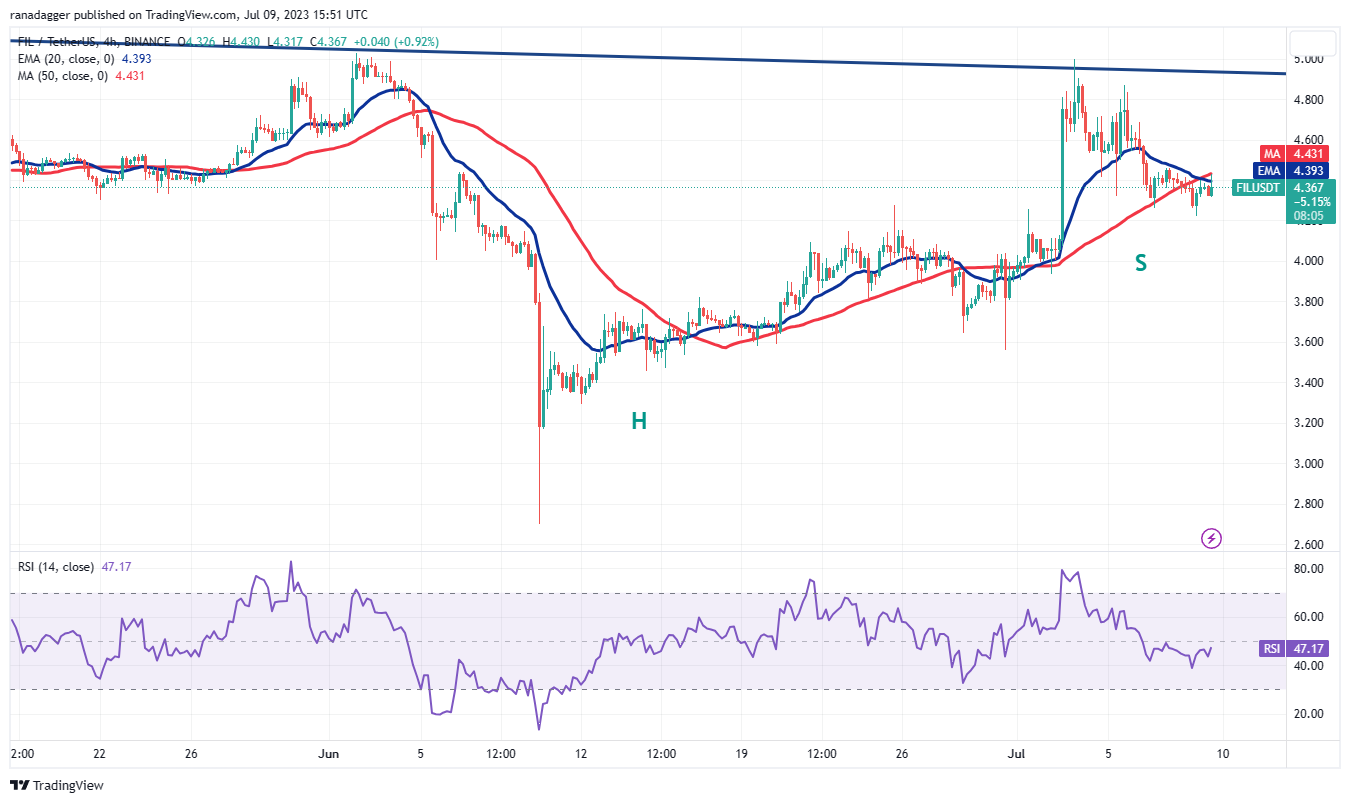 Filecoin (FIL) is trying to form an inverse head and shoulders pattern which will complete on a break and close above the neckline near $5.