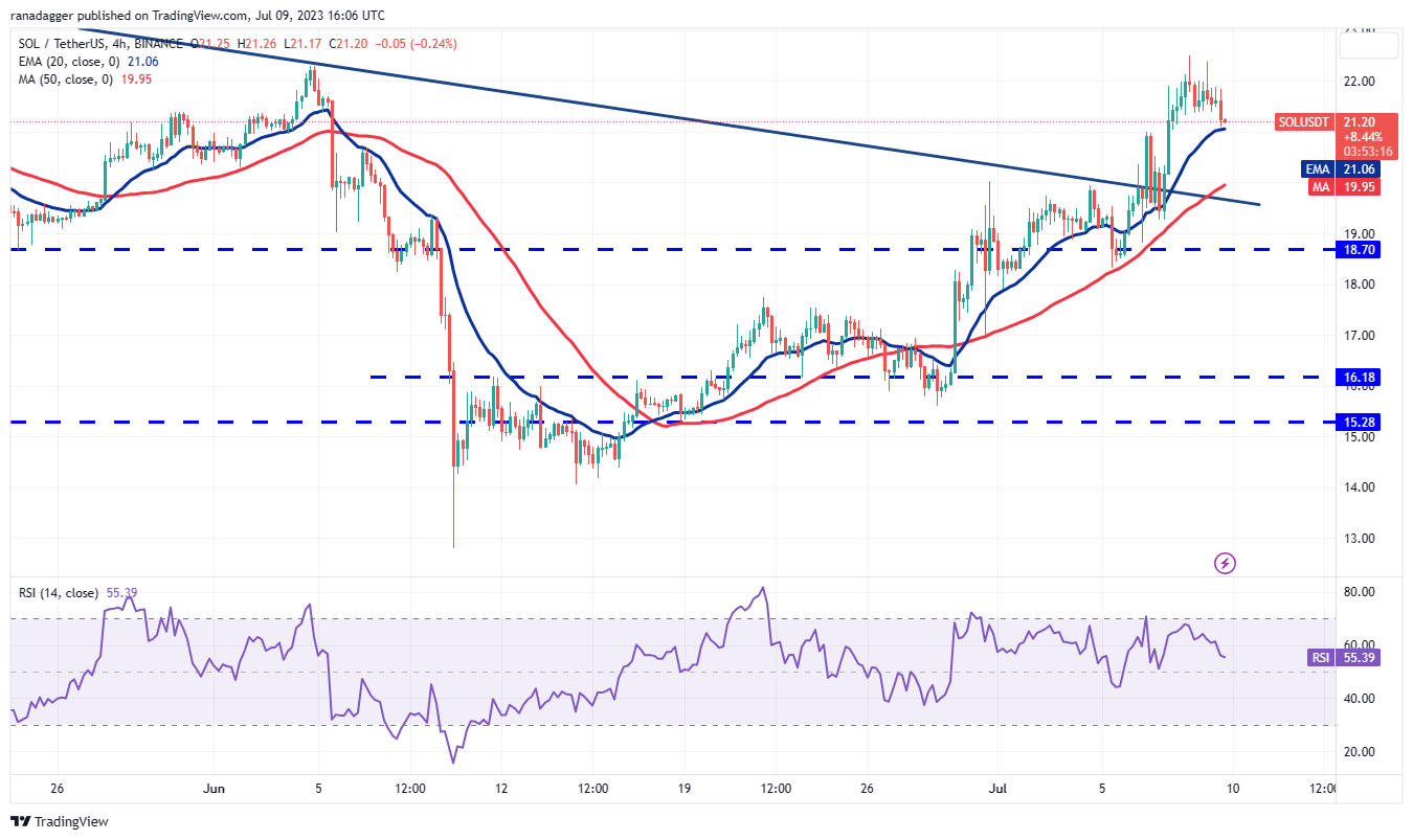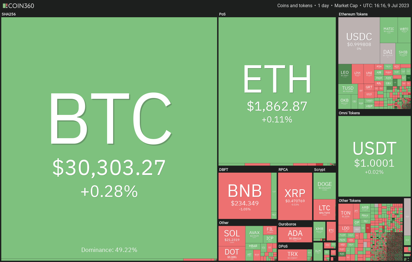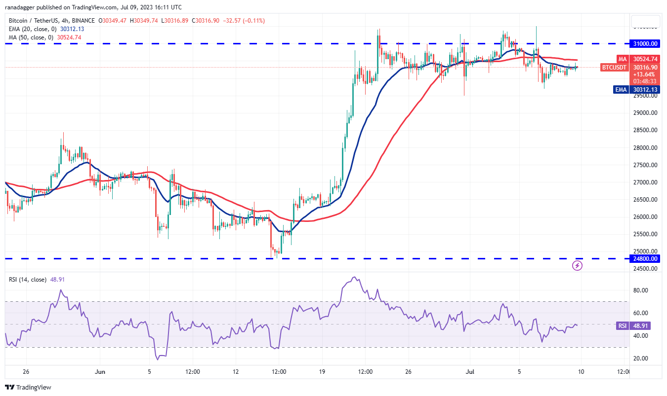 Bitcoin remains stuck between the 20-day exponential moving average ($29,854) and the overhead resistance at $31,000. This suggests uncertainty among the bulls and the bears about the next directional move.