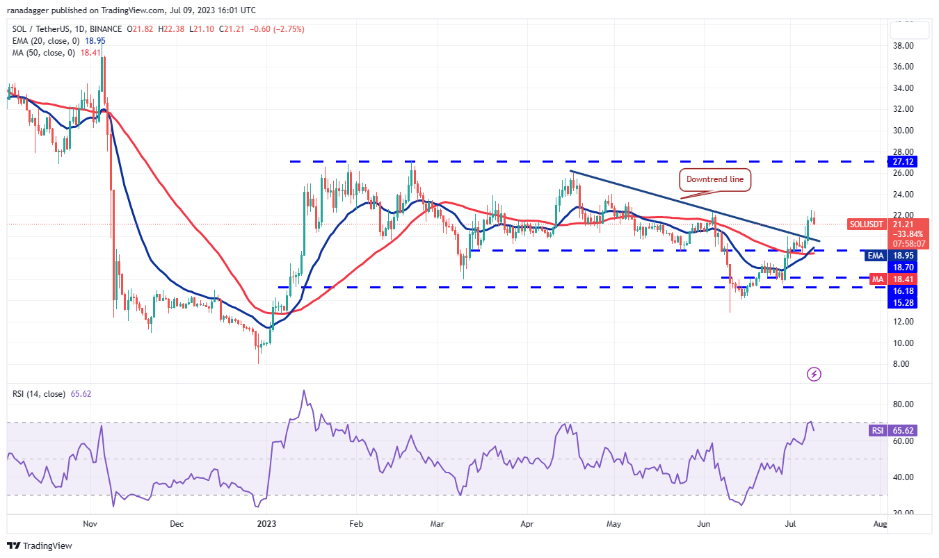 Solana (SOL) has been trading in a large range between $15.28 and $27.12 for the past several months. The failure to sustain the price below the support of the range started an up-move that has risen above the downtrend line. This suggests that the bulls are attempting a comeback.