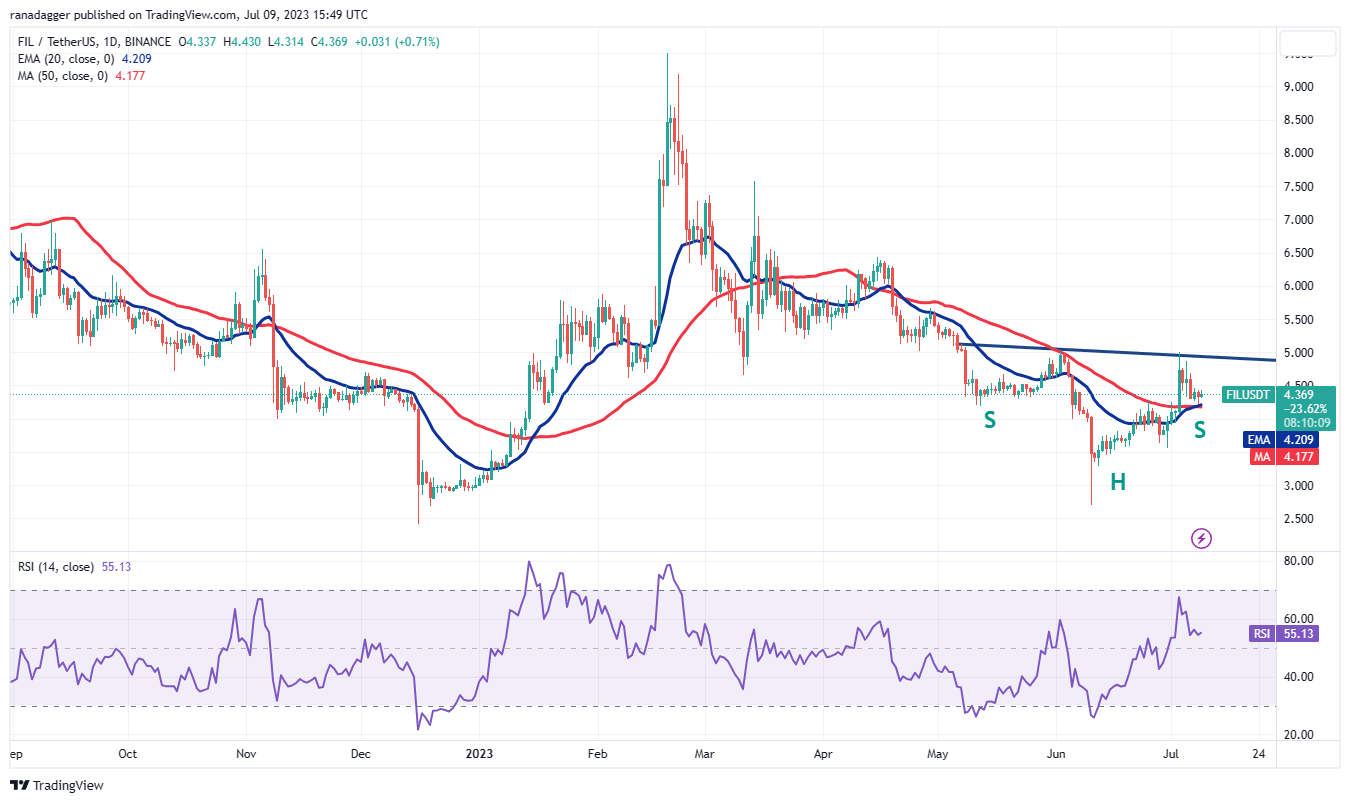 The moving averages are about to complete a bullish crossover and the RSI is in the positive territory. This indicates that bulls have a slight edge. The bulls will try to drive the price to the neckline of the reversal pattern. If bulls overcome this barrier, the FIL/USDT pair may start a new up-move. The pattern target of this bullish setup is $7.30.