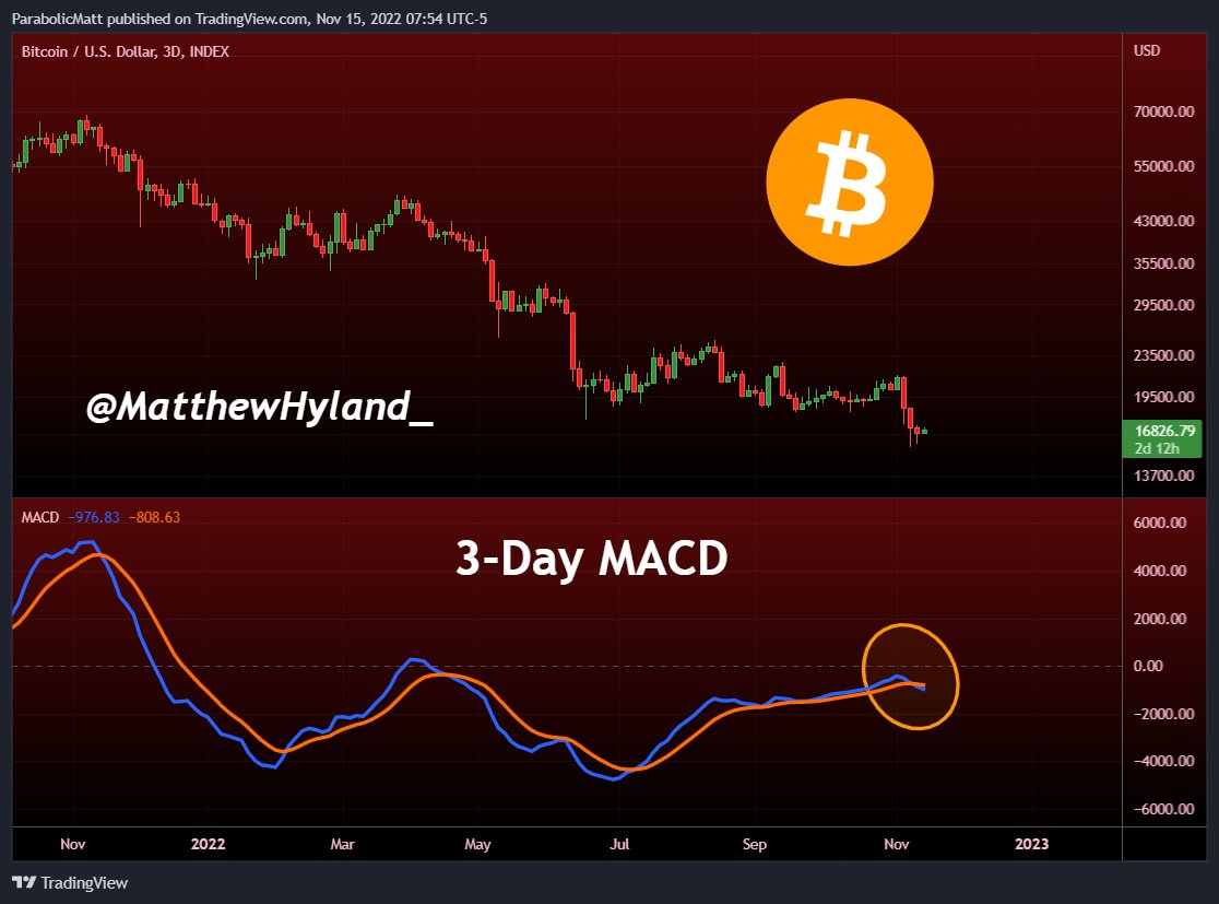 “The previous two crosses resulted in -46% and -57% moves AFTER the cross was confirmed,” he reiterated about the three-day chart’s moving average convergence/divergence (MACD) indicator.