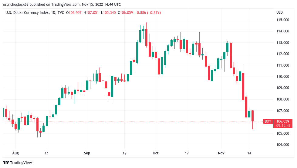 The already precarious U.S. dollar index (DXY), meanwhile, felt the pressure, briefly dropping below 105.5 to its lowest levels since mid-August.