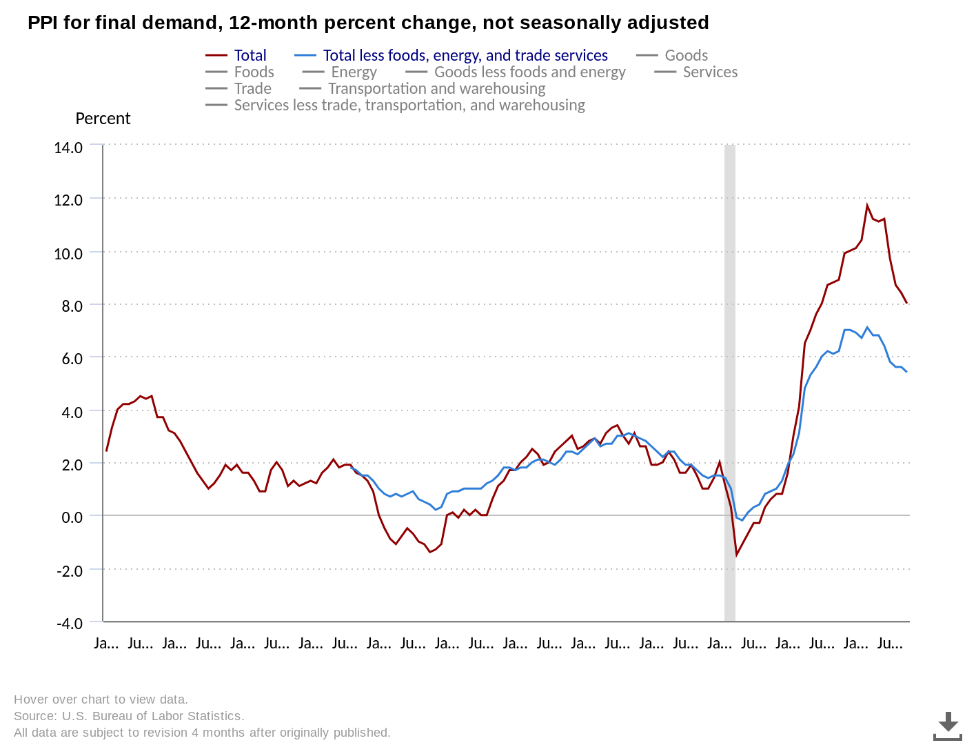 Core PPI was unchanged month-on-month, with the PPI overall up 0.2% versus the 0.4% forecast. Year-on-year PPI was 8% versus the 8.3% forecast.