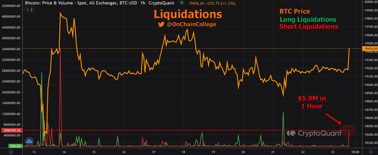 “Around $6 million in Bitcoin Short Liquidations over the last hour. This is the highest short liquidation level in 10 days,” it confirmed alongside data from on-chain analytics platform CryptoQuant.