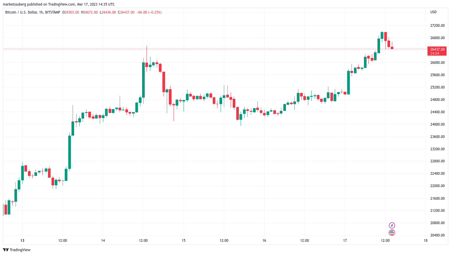 Data from Cointelegraph Markets Pro and TradingView showed BTC/USD hitting $27,025 on Bitstamp before consolidating.