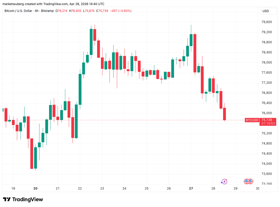 Data from TradingView showed BTC/USD dipping under $76,000 as US stocks also opened lower.