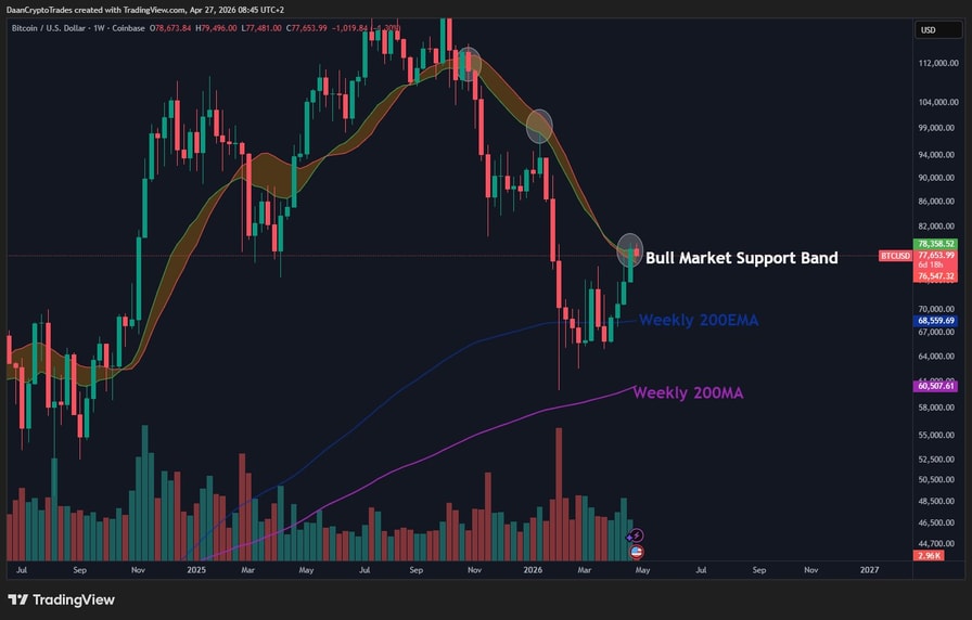 BTC/USD one-week chart with bull market support band, moving averages. Source: Daan Crypto Trades/X