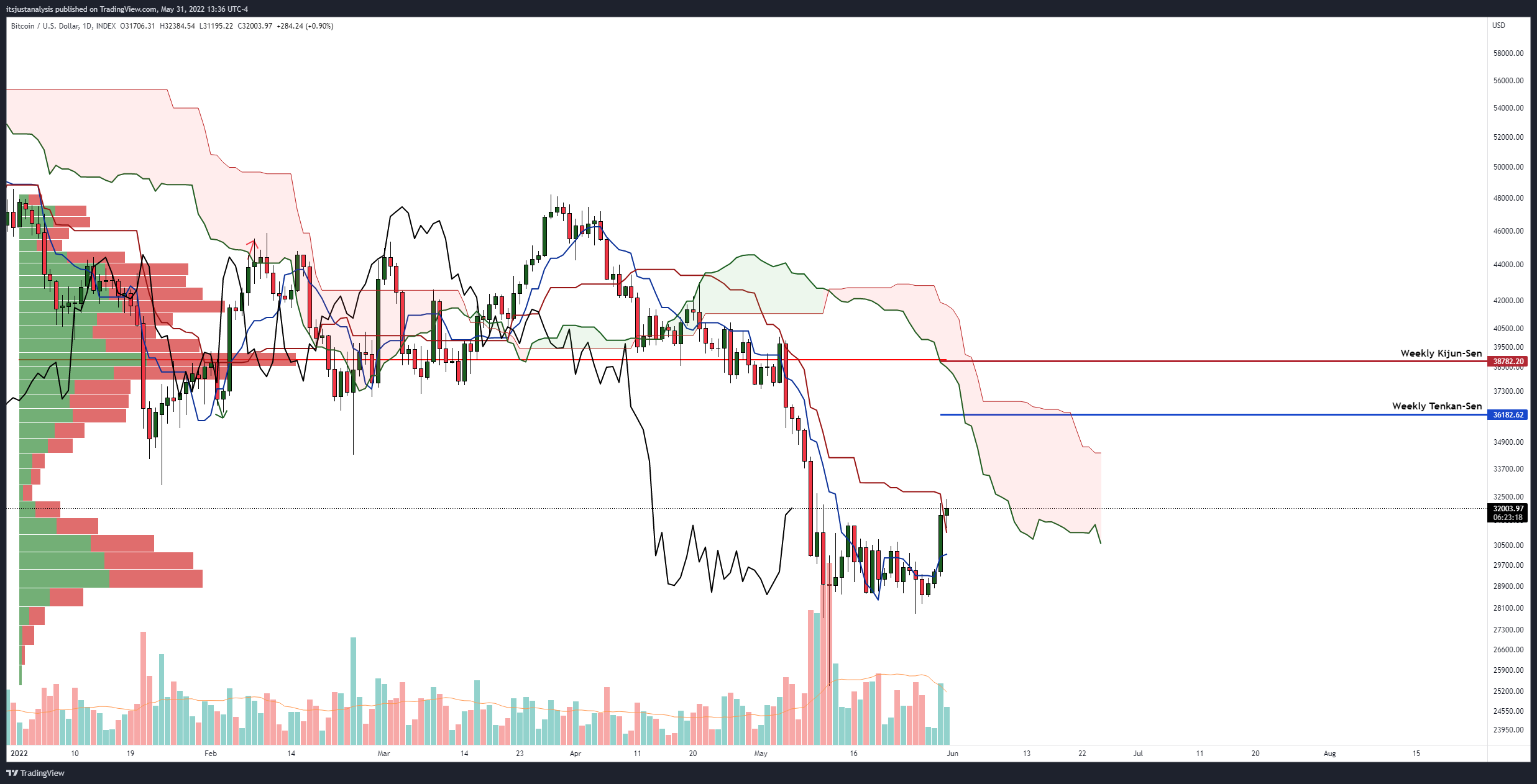 If Bitcoin price can close above the daily Kijun-Sen at or above $31,350, then BTC has a very open path to hit the $37,000 value area. Additionally, the 2022 volume profile is very thin, between $32,000 and $37,000. But $37,000 may be where the bulls face sellers again.