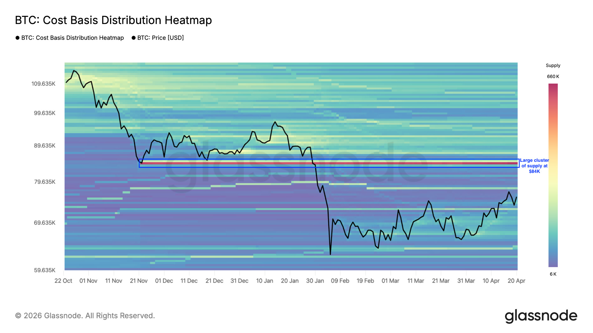According to Bitcoin’s cost basis distribution data, investors hold approximately 1.1 million BTC at an average cost of $84,000, creating a potential resistance zone. This concentration suggests many investors may sell at break-even, potentially stalling Bitcoin’s upward momentum.