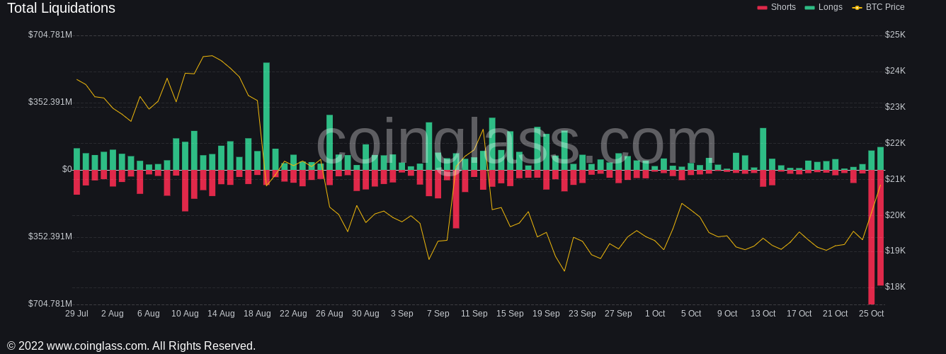Liquidations also kept flowing, with the past 24 hours delivering $750 million in liquidated positions on Bitcoin alone, according to data from Coinglass.
